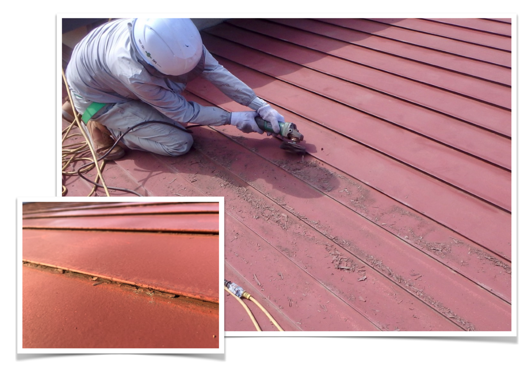 北側の下屋は日当たりが悪く、潰れたハゼの中に水が溜まっていました。コケもびっしり生えていて、高圧洗浄では落とし切れないので、これも事前に擦り落としました。