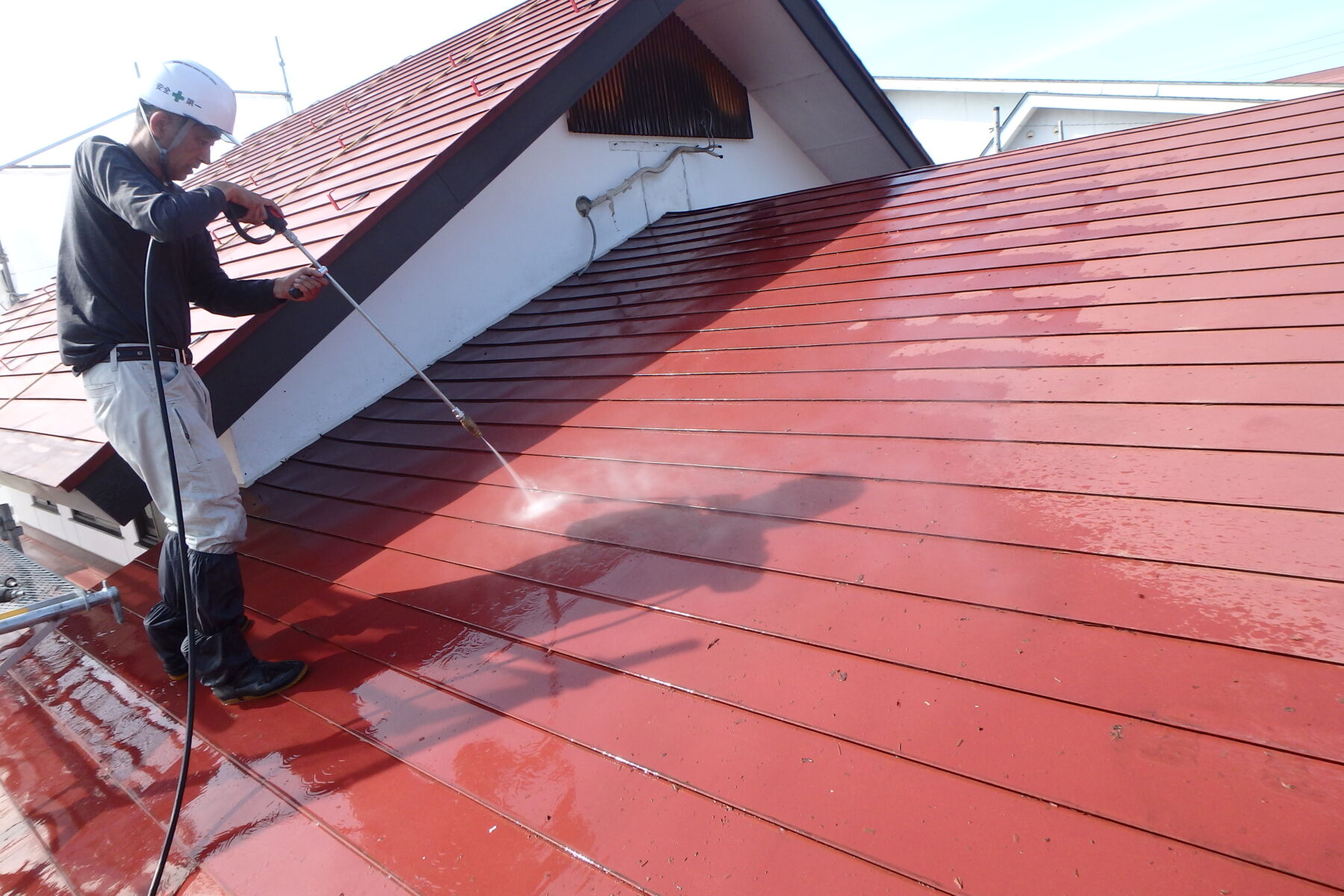 屋根に対して垂直な角度で水圧を生かした洗浄を行います。