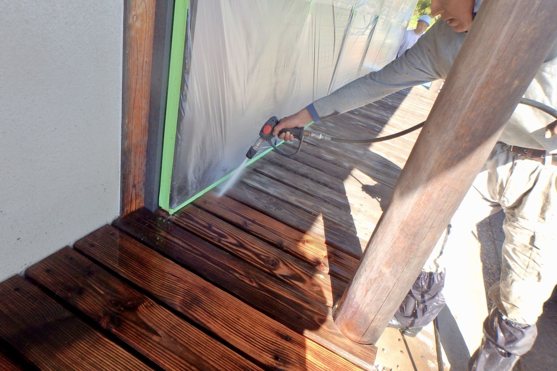 ノズルでパターンと水圧を調整できる洗浄ガンで、美しい木目が再現するように洗浄します。