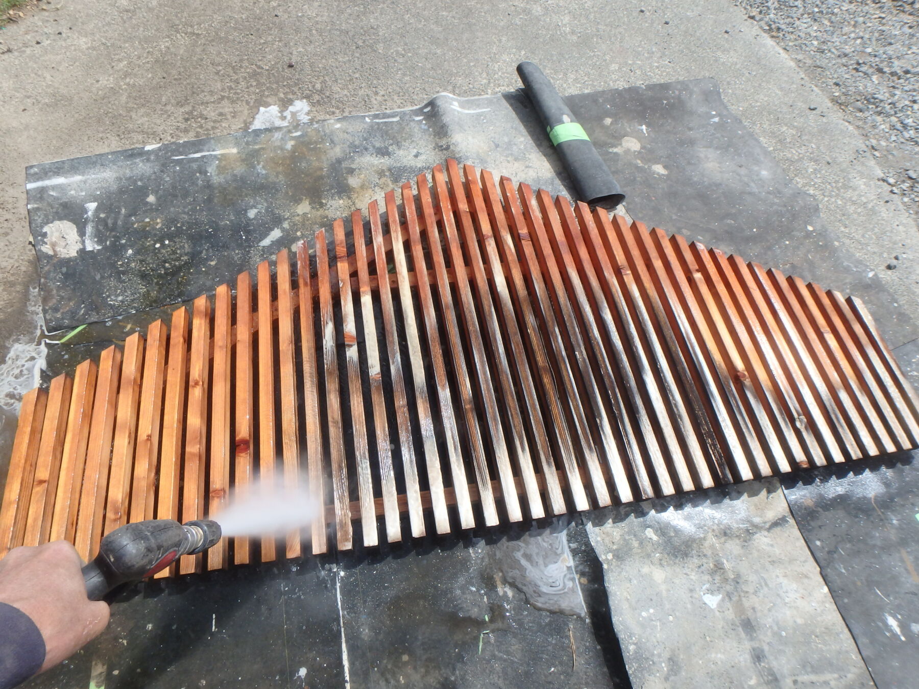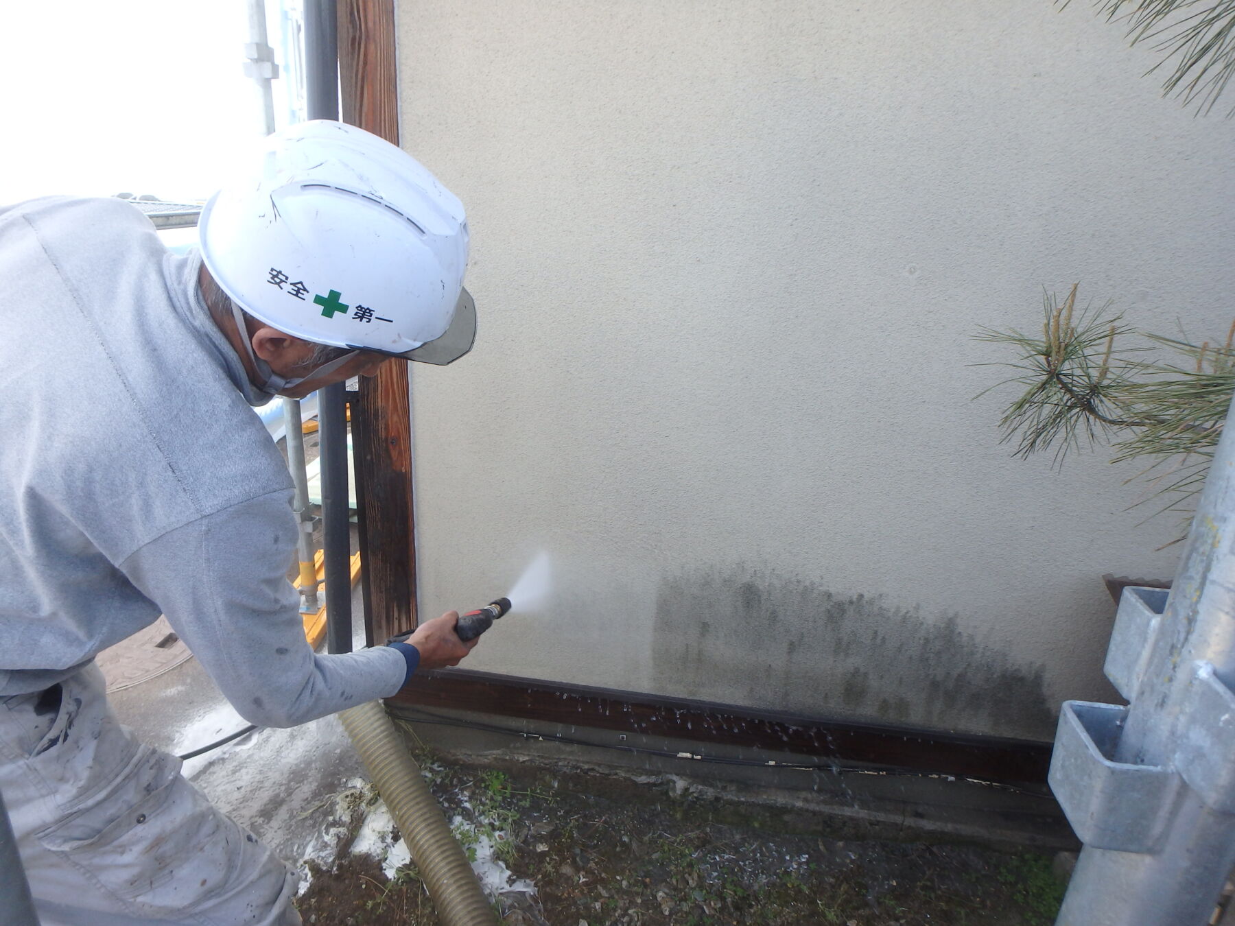 アク抜きの薬剤を散布後、高圧洗浄で表面の黒ずみを洗い流します。