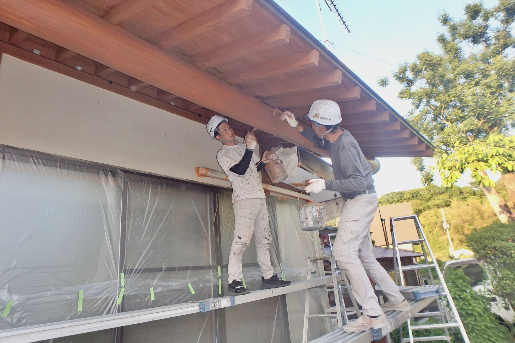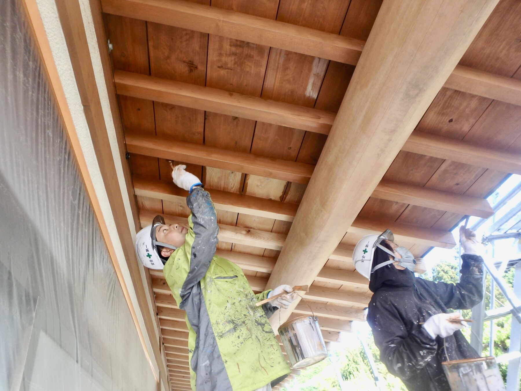 ムラにならないように桁の両側で二人で仕上塗装をしました。