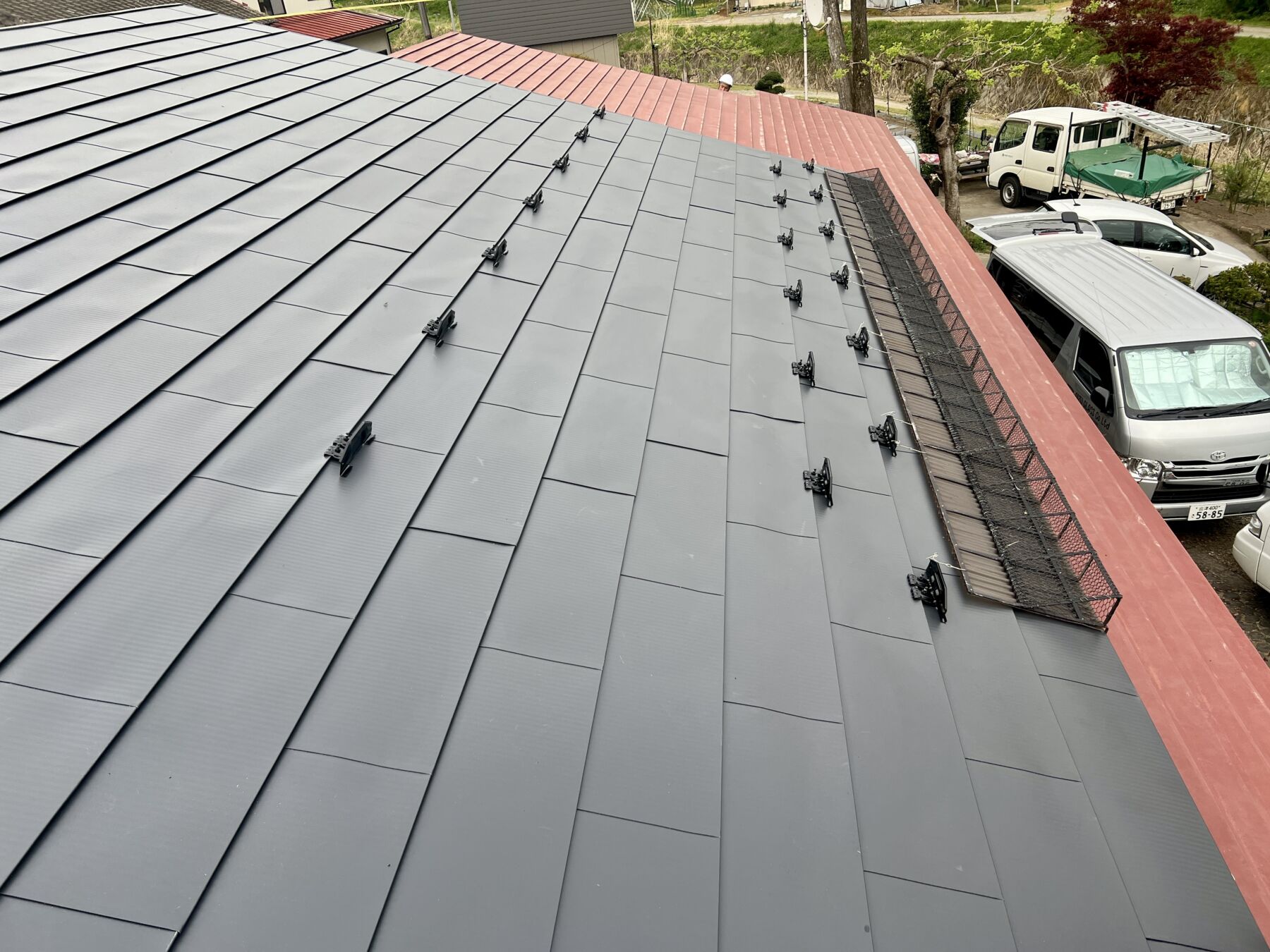 葺き替え前と同じ位置に「雪止め」と「スノーネット」を取り付けました。