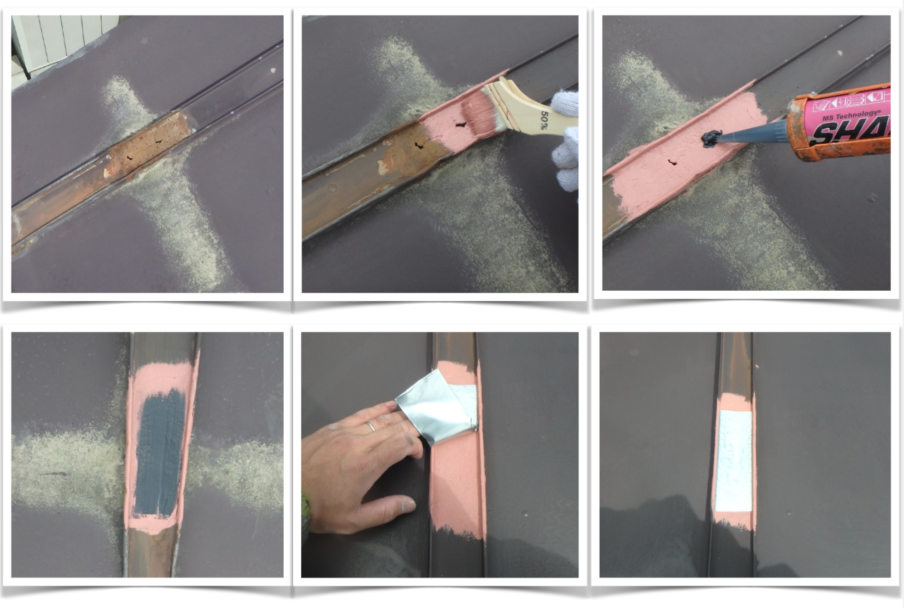 錆止め塗装→シーリングで穴を塞ぐ→アルミテープで補強をしました。