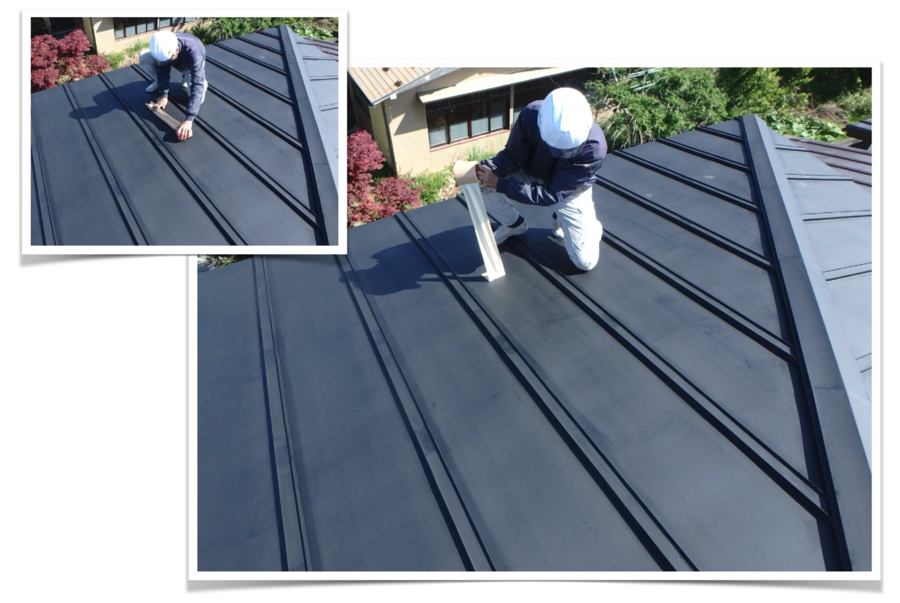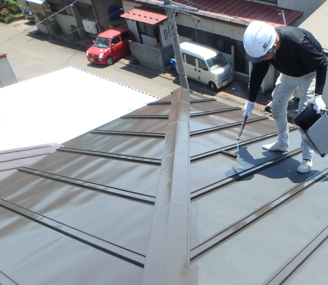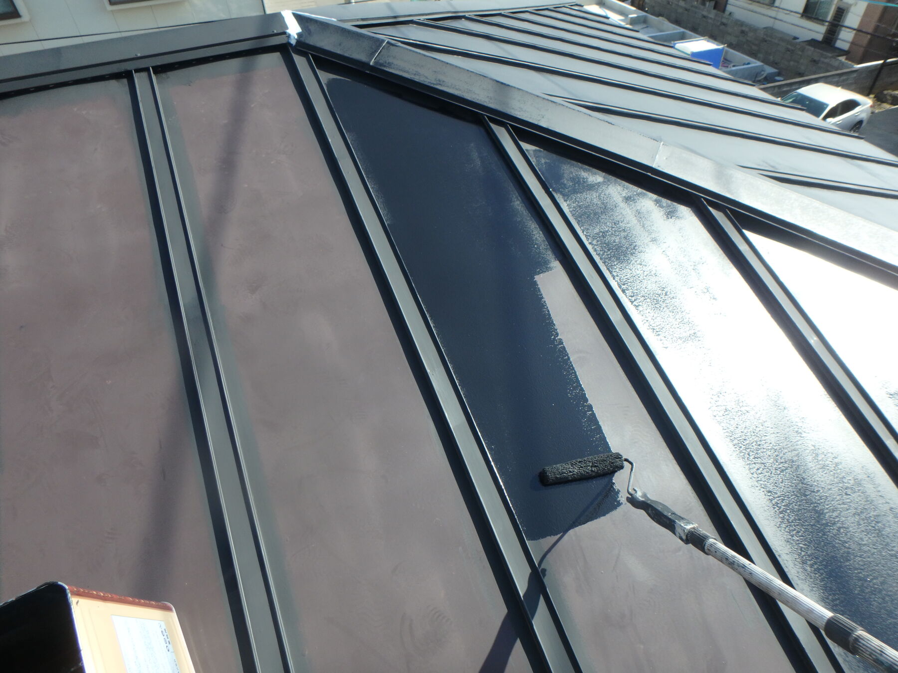 先に細部(瓦棒)をハケで塗装し、平場はローラーで適切な厚みに塗装します。