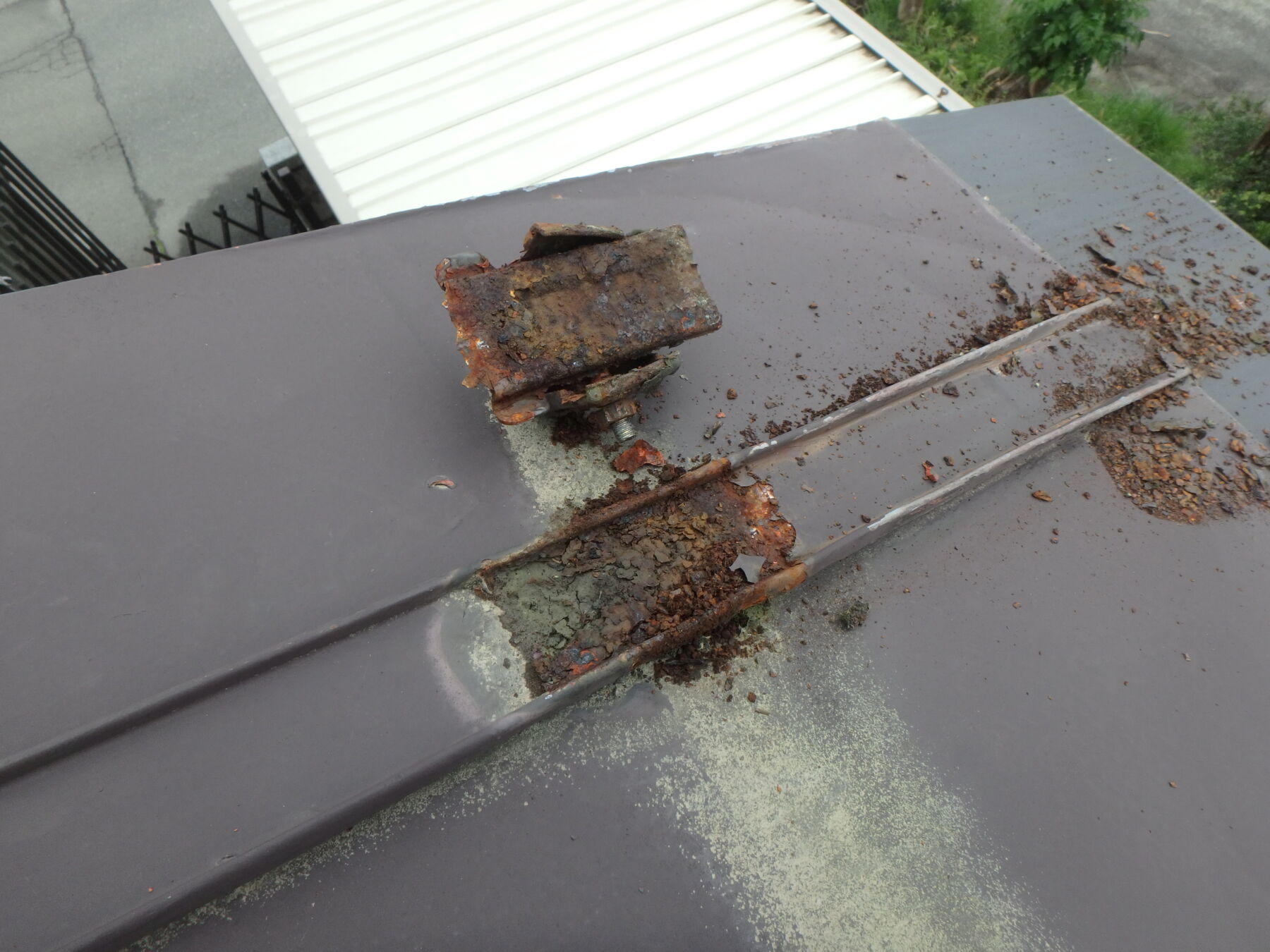 雪止め部分の屋根から茶色の錆汁が流れ出ていました。