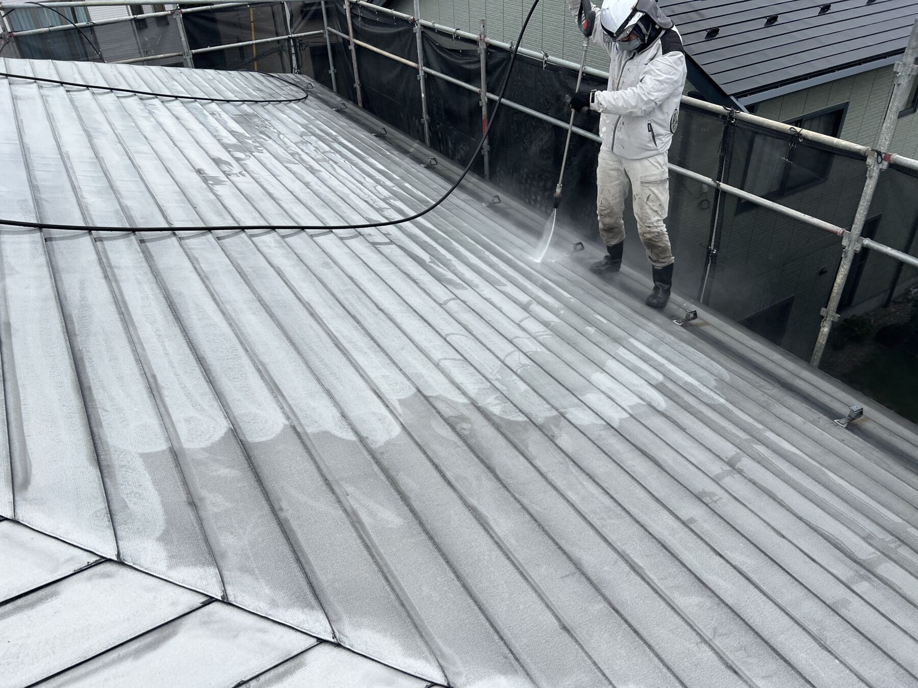 屋根に対して垂直な角度で水圧を活かした洗浄をします。