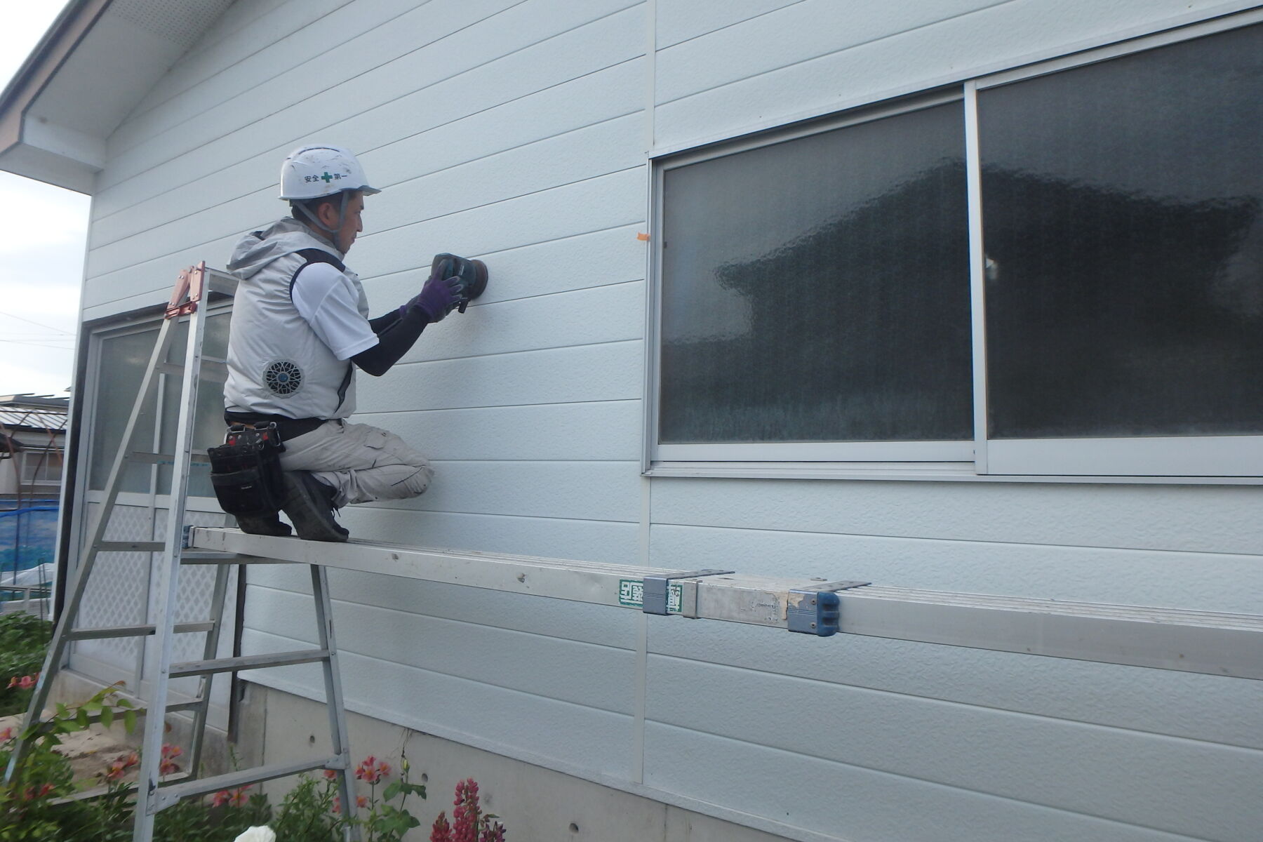 外壁の目粗し:塗装歴がない外壁です。洗浄前に電動工具で「目粗し」しました。