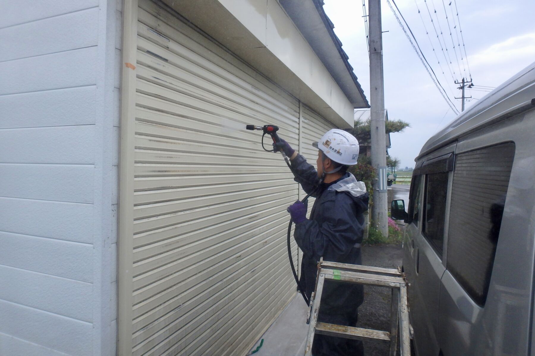 手元で水圧調整できる洗浄ガンを使って、シャッターに対して垂直に水圧を生かした洗浄をします。