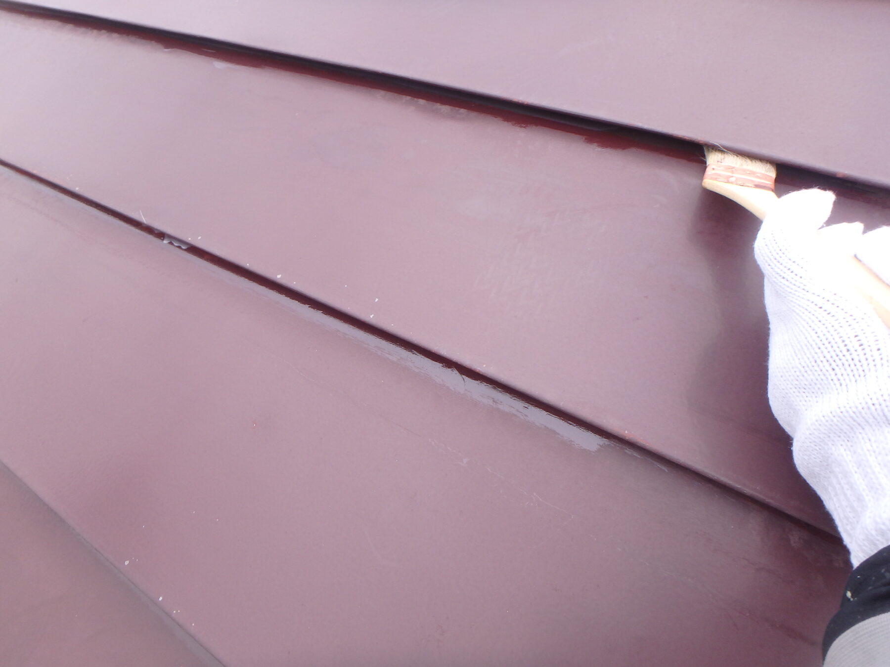 下塗と同様に、ハゼなどの細部は刷毛で奥までしっかり塗装し、平場はローラーで適切な厚みに塗装します。