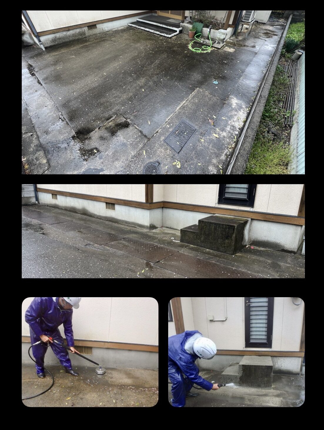 「黒く汚染された土間をキレイにしたい」との要望で洗浄を行いました。