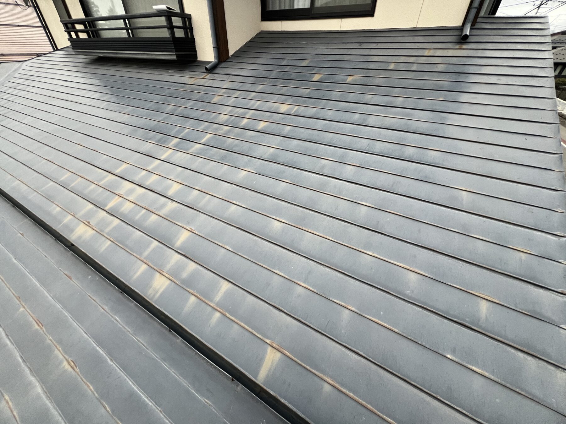 屋根塗装後、屋根這わせ雨樋を設置して錆を改善します。