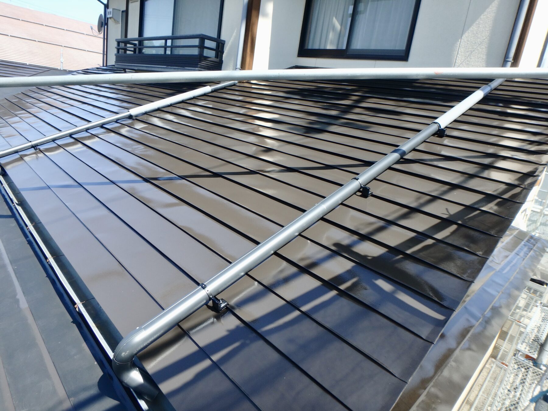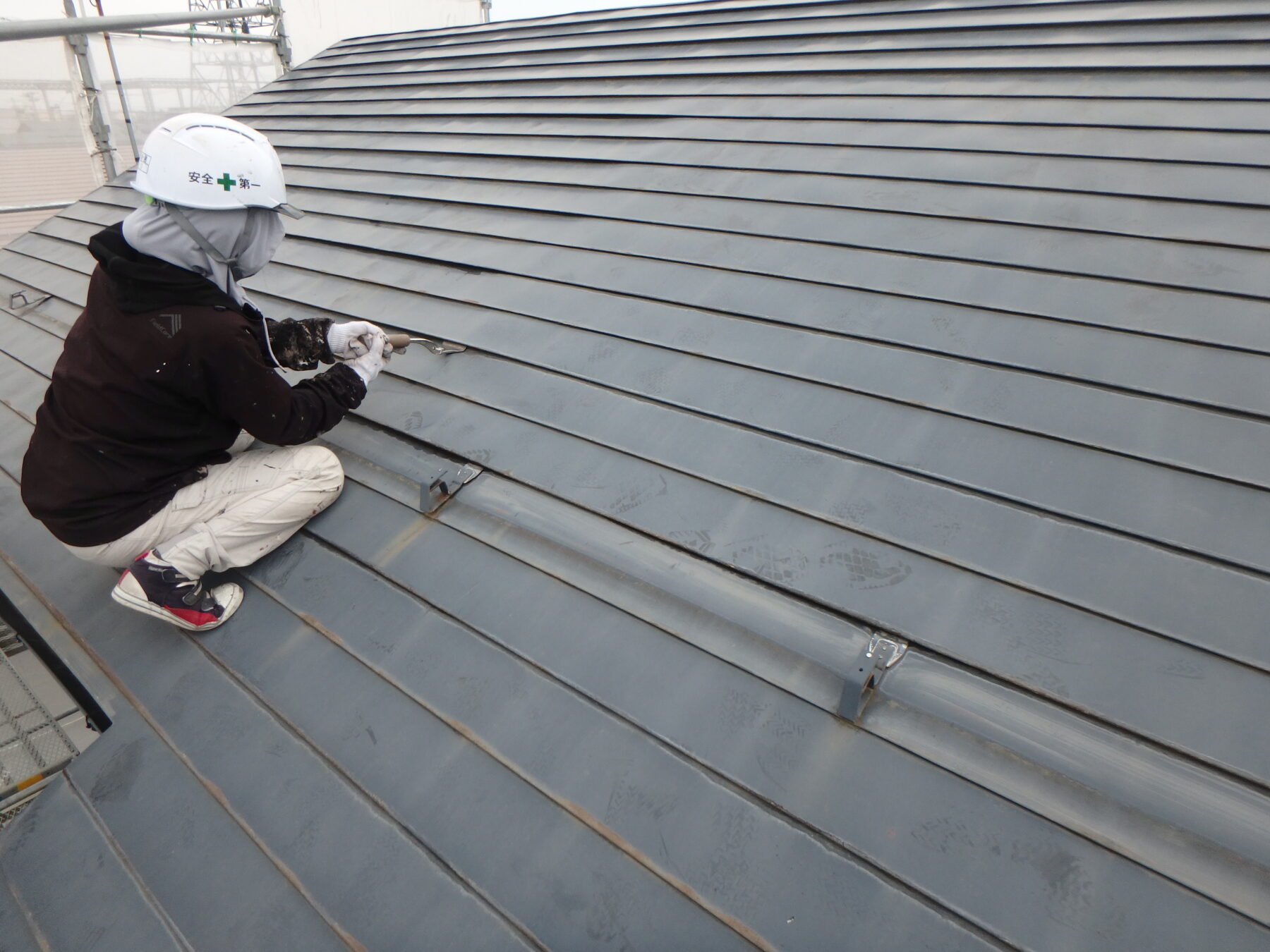 雪止めアングルを外した状態で屋根塗装しています。