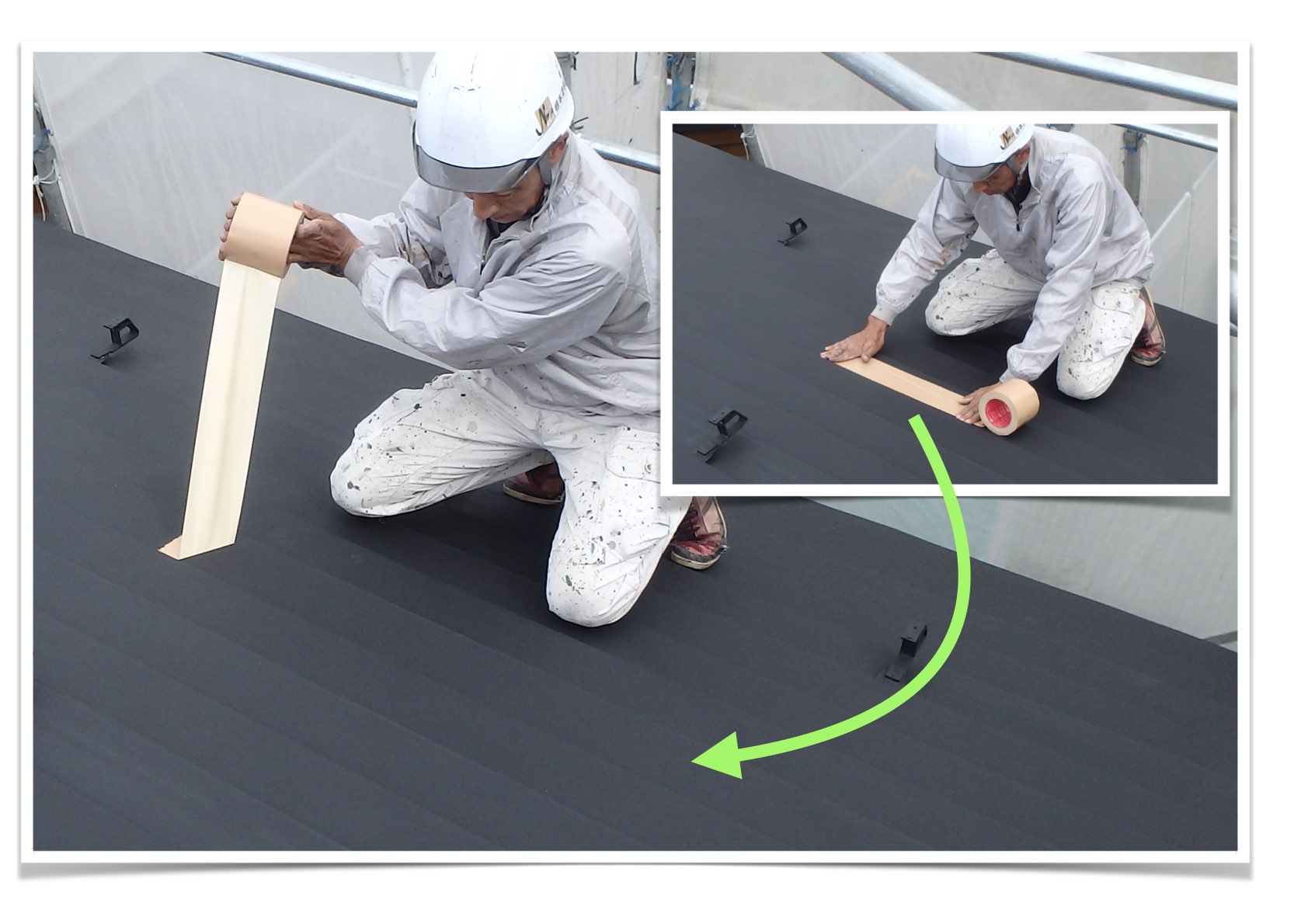10㎝幅のガムテープを屋根に貼り付け、一気に剥がして塗料の付着を確認します。